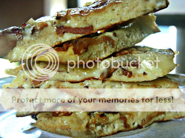 In a bowl, combine eggs, bread, cheese, bacon and onion. Let the batter sit for 5-10 minutes or as soon as you can moosh (is that a word hahaha) your bread. The consistency should resemble that of well, pancake batter.